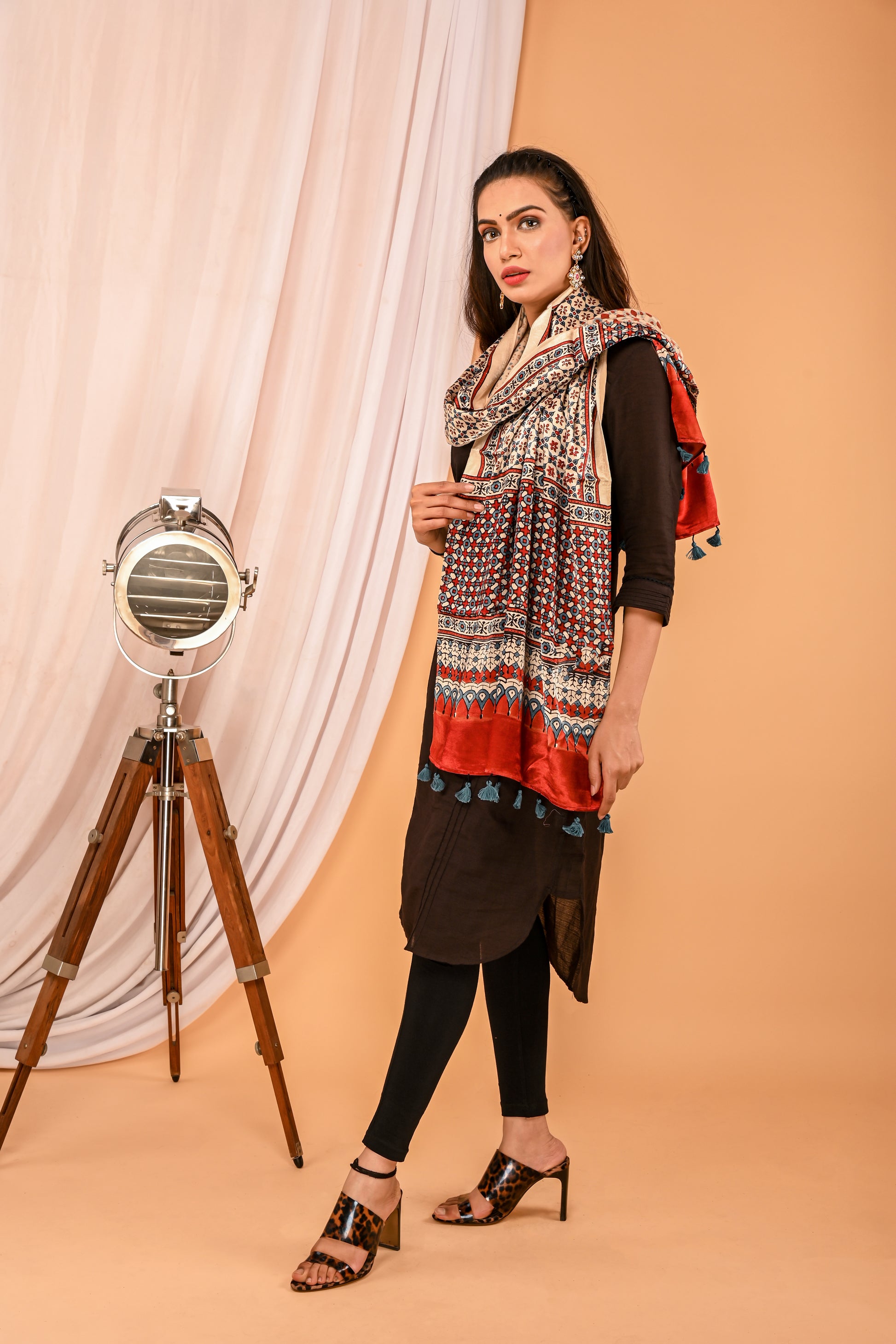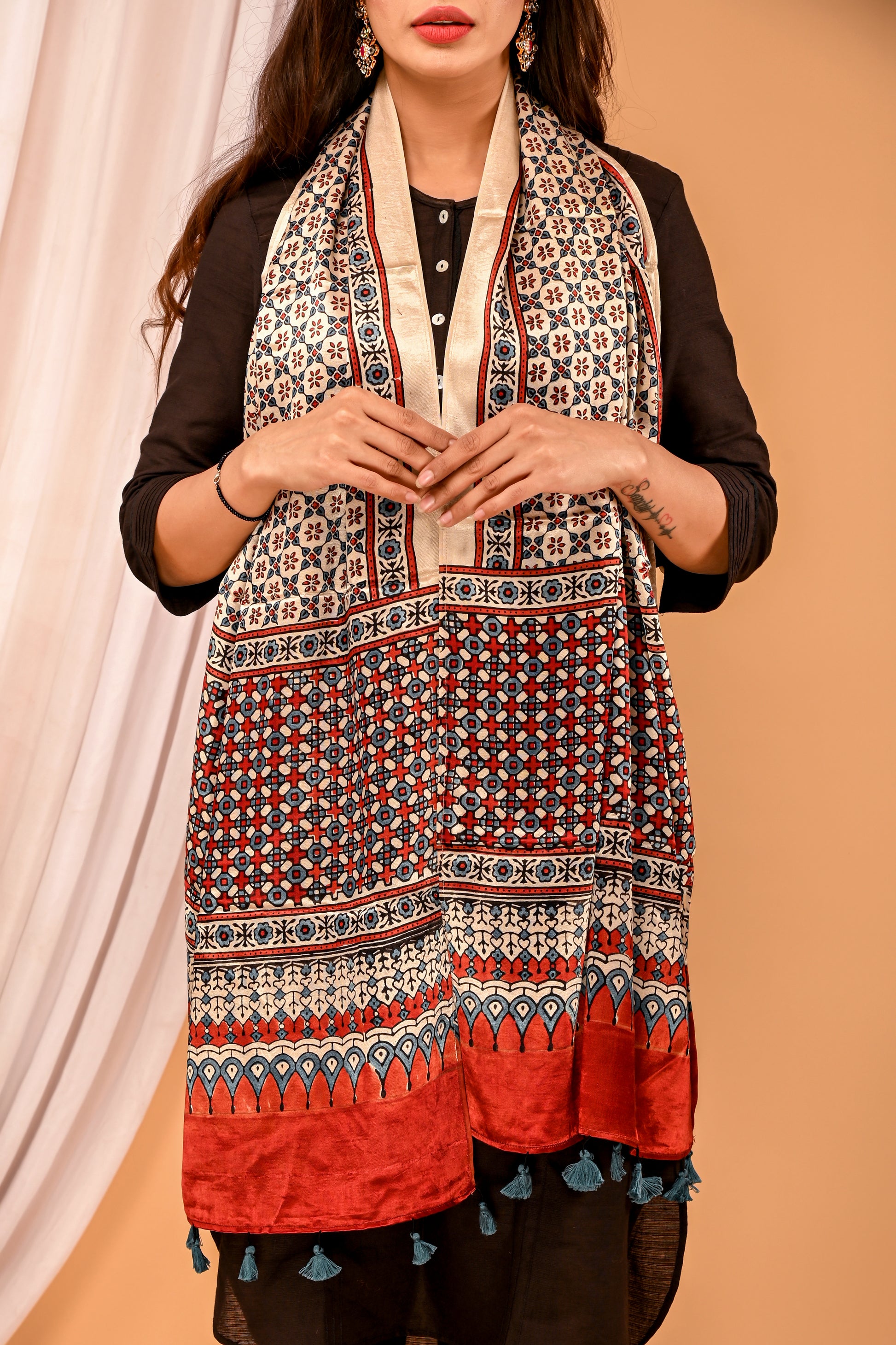 - Ajrakh is created through a meticulous mud-resist dyeing technique, where artisans use hand-carved wooden blocks to apply kaat on the fabric.