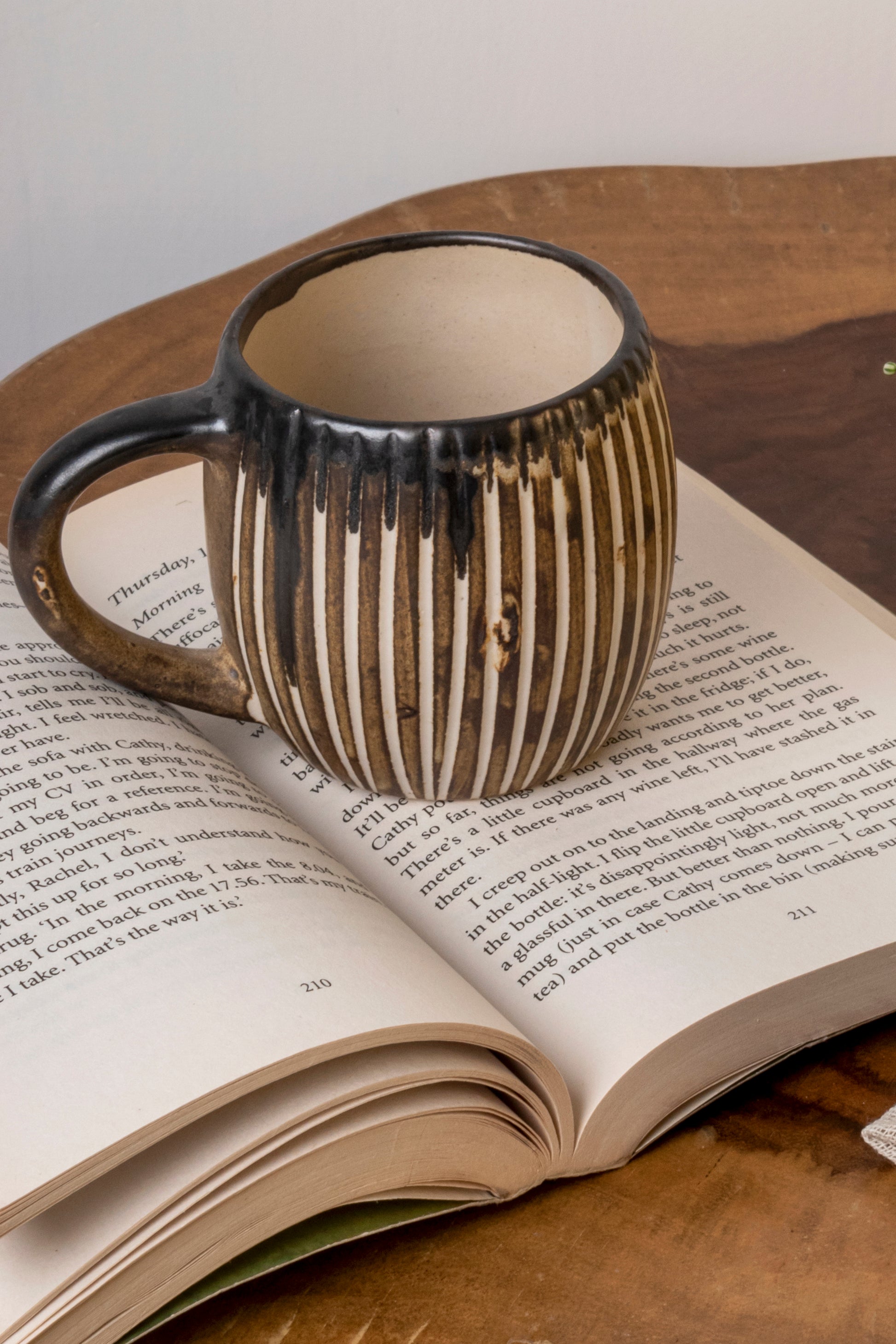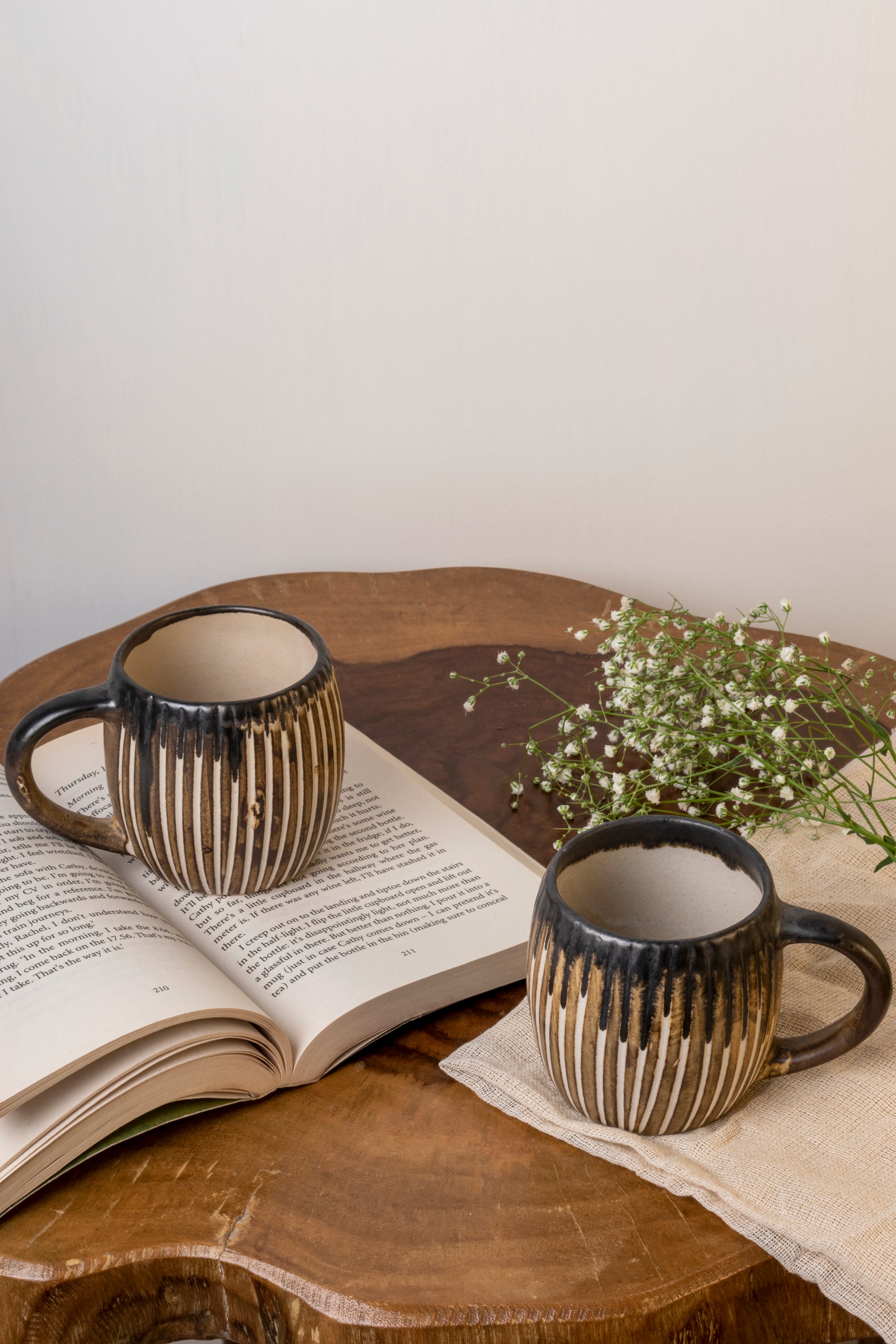This exquisite brown ceramic mug set blends artistry with functionality. Handcrafted by skilled artisans of India, each mug features a stunning flowing design in light and dark brown that captures the essence of natural elegance. The rich brown color enhances the aesthetic appeal, making it a versatile addition to any kitchen or dining area.
