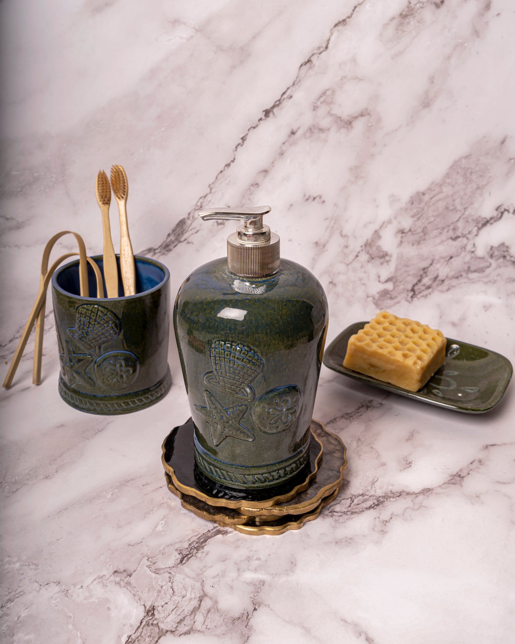 Transform your bathroom into a sanctuary of style with our exquisite ceramic bathroom set of 3, adorned with intricately carved designs inspired by sea shells and stars. Handcrafted by skilled artisans of India, each piece in this set reflects the timeless artistry of Khurja Pottery, renowned for its meticulous craftsmanship and aesthetic appeal.