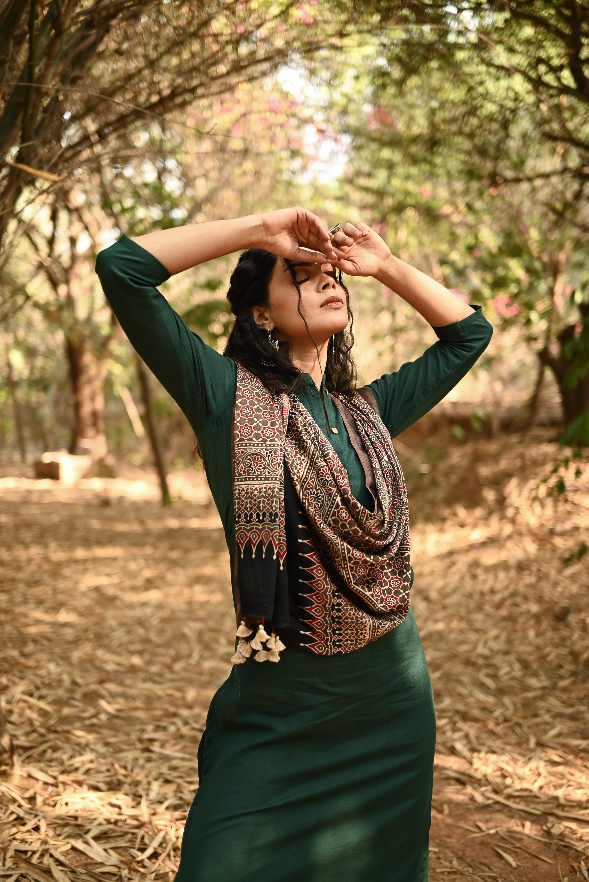 - Ajrakh is created through a traditional mud-resist dyeing process, where artisans apply kaat using hand-carved wooden blocks on the fabric.