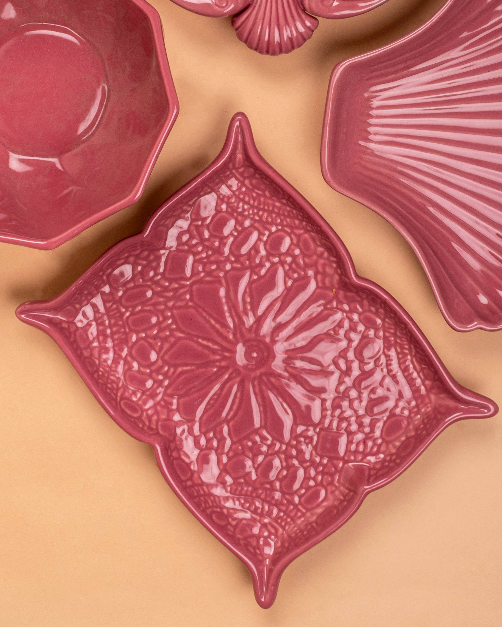 Enhance your dining experience with our exquisite pink ceramic rectangle serving plate, handcrafted by skilled artisans of India. Featuring a beautifully carved design and soft pink hue, this plate blends artistry with functionality. The designer edges add sophistication, making it a statement piece for any occasion.