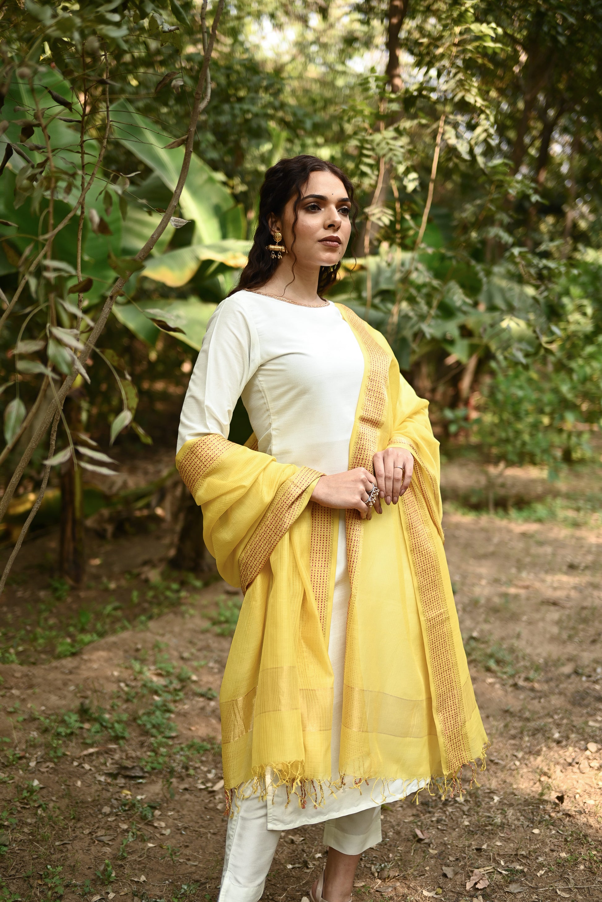- A classic banarasi silk dupatta elegantly woven with a traditional golden border, adding sophistication to your ensemble
