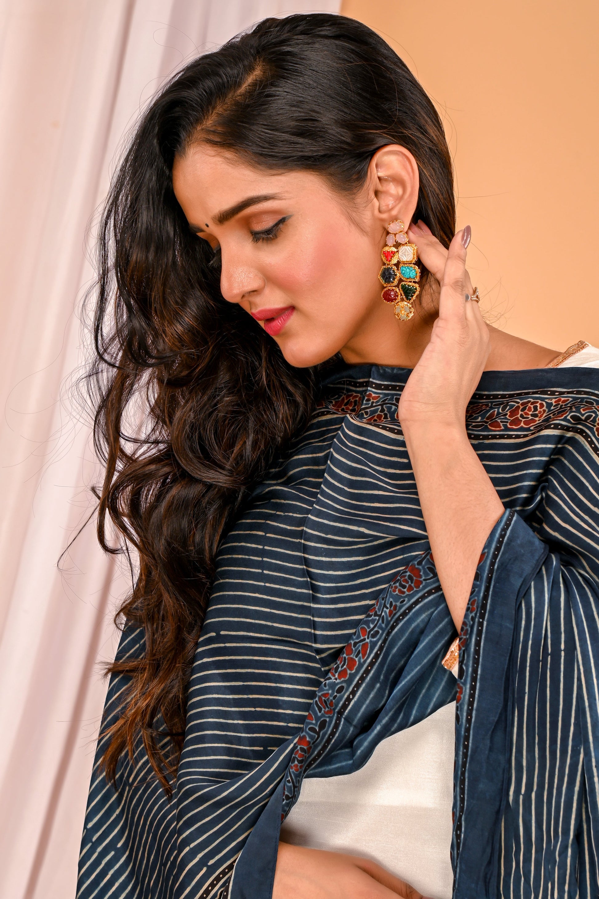 Tahira Multicolor Drop Earrings, a true masterpiece of fine craftsmanship. Designed to captivate, these exquisite earrings feature a vibrant array of multicolored stones set in high-quality brass, offering a stunning blend of tradition and contemporary style.