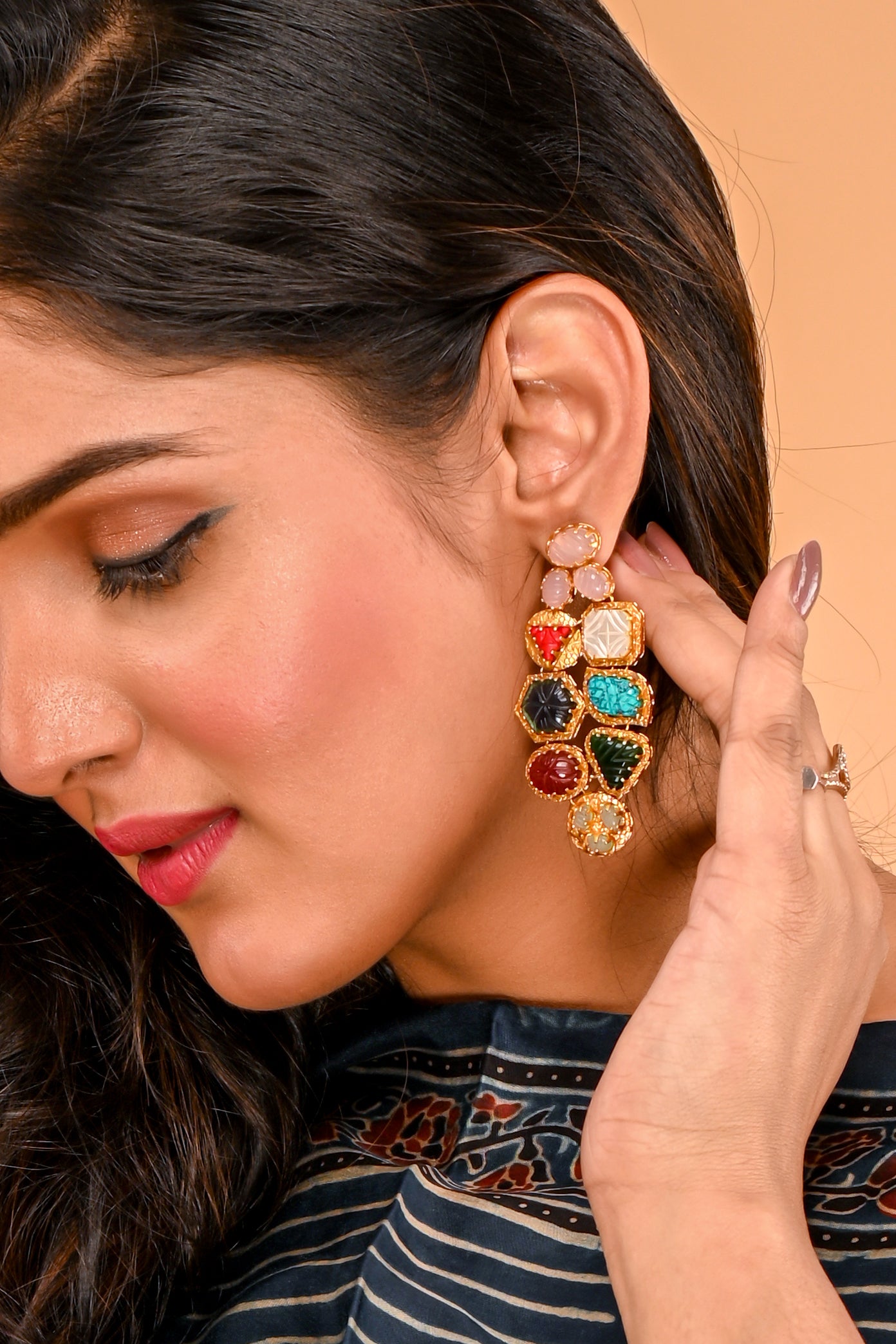 - Vibrant Multicolored Stones: Adorned with an array of handpicked stones in striking colors, adding a pop of elegance to any outfit.
